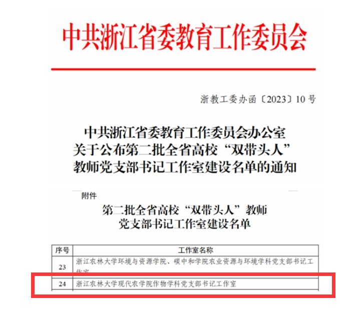 近期,浙江省委教育工委公布了第二批全省高校“双带头人”教师党支部书记工作室建设名单,我院作物学科党支部获批建设。