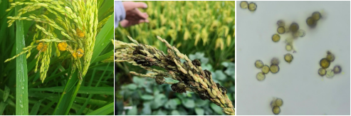 根据为害特点,学生在稻穗上发现了稻曲病,被压弯腰的稻子,走近看才发现穗上挂满了黄色、墨绿色的稻曲球;在稻株茎基部发现了云形大斑的纹枯病。另外,学生发现了稻瘟病中的谷粒瘟和叶瘟,辨析了不同病斑类型的叶瘟:慢性型病斑、急性型病斑、褐点型病斑。