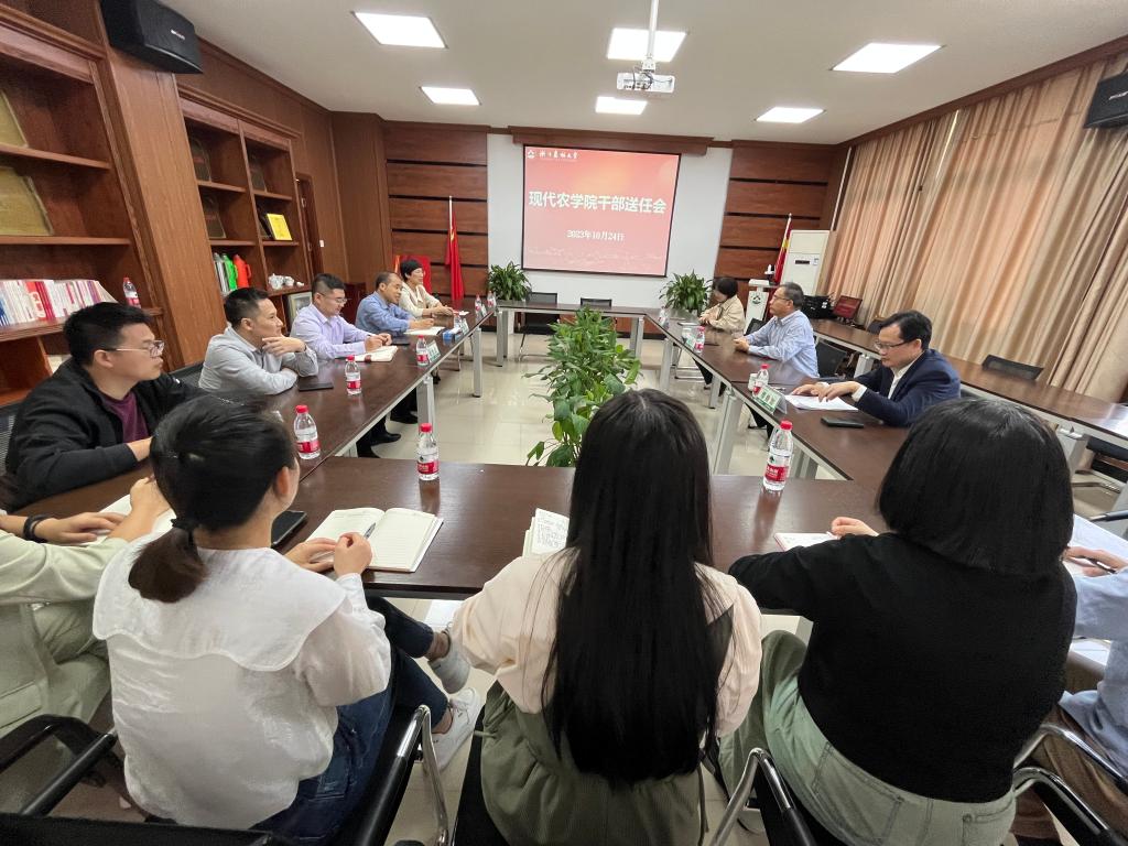 10月24日,农学院召开干部送任大会。副校长胡祖吉出席会议并讲话。党委委员、组织部部长缪鲁加主持会议,农学院领导班子、学科管理团队成员及教职工代表参加会议。