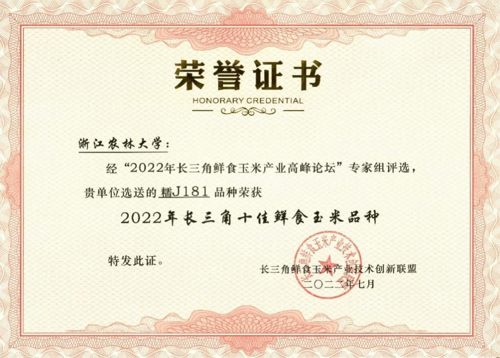 图2 玉米新品种‘糯J181’荣获2022年长三角十佳鲜食玉米品种