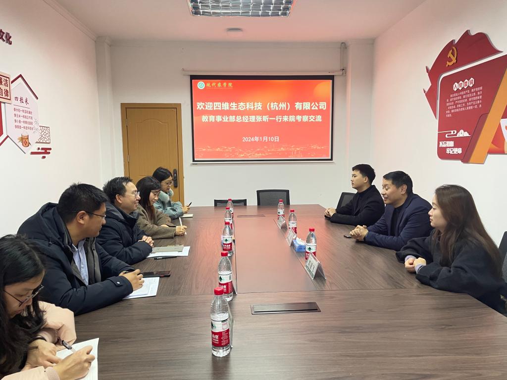 1月10日,四维生态科技(杭州)有限公司教育事业部总经理张昕一行来我院考察交流。学院党委书记梁卫玲、副院长周国鑫、党委副书记宋春春、植物保护专业负责人饶琼、智慧农业专业负责人吕尊富及相关学科教师参加交流座谈,会议由周国鑫主持。