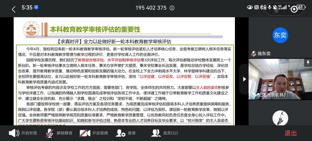 主题班会上,各班主任为同学们详细地讲解了本科教育教学审核评估工作的具体内容和流程,希望同学们深刻领会此次评估的重要性,倡导班级同学以“校兴我荣”的主人翁姿态和优良的学风参与到评估中去,配合学校做好线上、线下审核评估工作,展现良好的学习状态和精神风貌。
